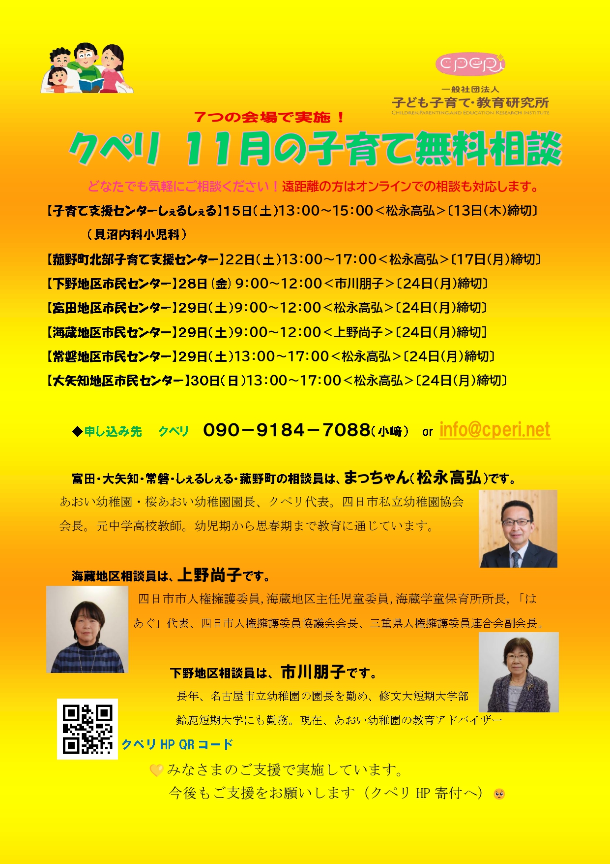 11月の「子育て無料相談」です。地区外や市外の方もお受けしますので遠慮なくお申し込みください。すべて事前予約制です。期日までにお申し込みください。