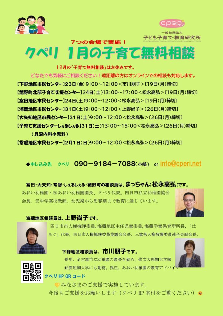 2025年11月25日 イベント情報 1月の子育て無料相談(12月はお休みです) 2025年10月31日 イベント情報 11月の子育て無料相談 2025年10月18日 イベント情報 子育て本を出版!ひろみちお兄さんも推薦! 2025年09月18日 イベント情報 10月の子育て無料相談 2025年08月18日 イベント情報 9月の「子育て無料相談」です! 子育てのことならクペリヘ!クペリといっしょに考えましょう 人は、子育てをしながら親になっていくのです。手探り、試行錯誤で子どもと向き合い、うまくいかないことや誤りを重ねながら子育てをしていくものです。クペリは、じっくりと親御さんと話し合い、解決・改善の道を一緒に見つけていきます。